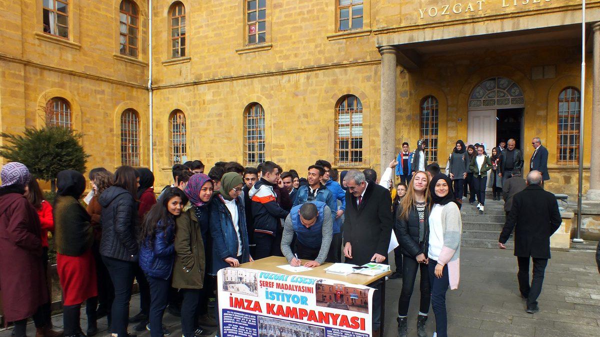 Tarihi lise önünde başlatılan kampanyaya öğrenciler imza atmak için uzun kuyruk oluşturdu. İmza kampanyası tertip komitesi üyesi Araştırmacı Yazar Osman Karaca, Yozgat Lisesi'nin öğrencilerinin 1914 yılında seferberlik ilanı ile birlikte gönüllü olarak silah altına girdiğini söyledi. Silah altına alınan öğretmenlerin subay olarak, öğrencilerin yedek subay olarak Çanakkale Savaşı'nda düşmana karşı mücadele ettiklerini anlatan Karaca, "Lisemizin 200'den fazla şehidi var. Biz istedik ki; Yozgat Lisesi'nin bu kahramanlığı madalya ile onurlandırılsın ve şehitlerimizin adı unutulmasın. Yozgat Lisesi'ne verilen bu şeref madalyası, şehitlerimizin Yozgat'taki abidesi olacaktır" dedi.