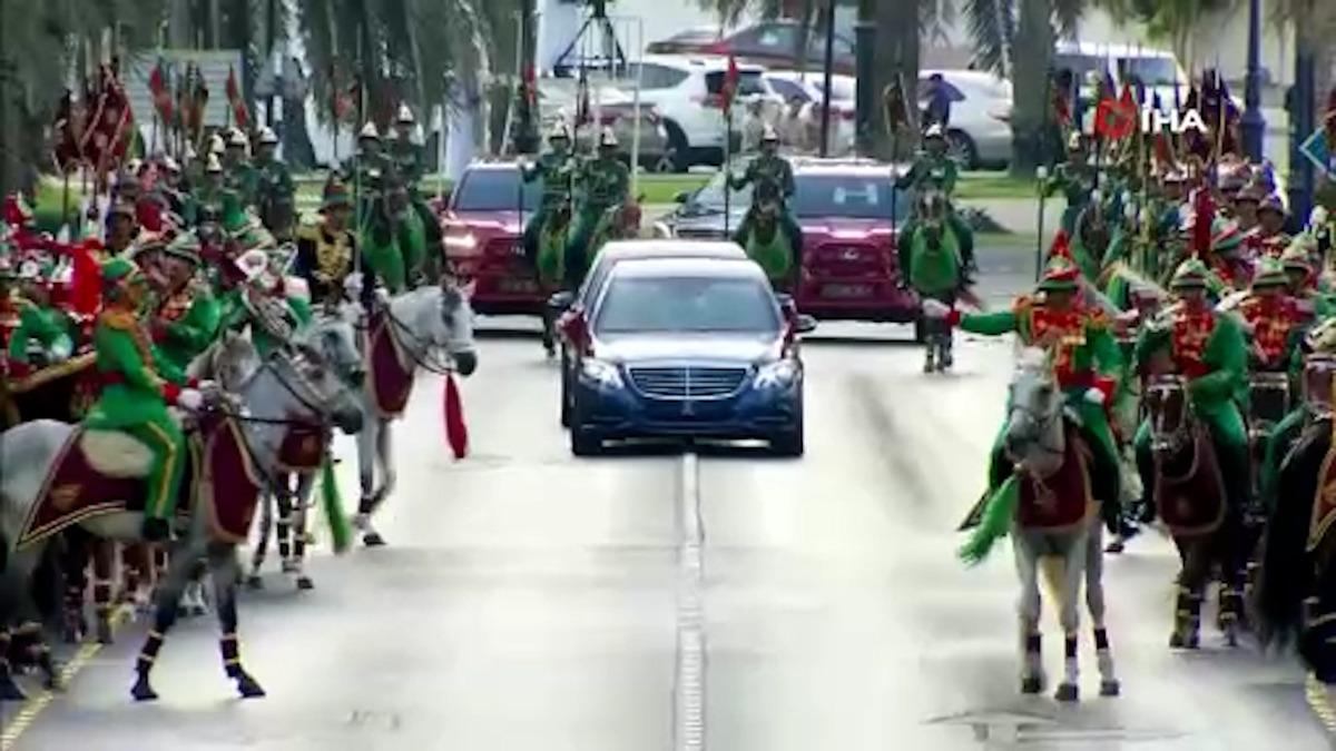 Cumhurbaşkanı Erdoğan'ın makam aracına, Al Alam Sarayı'na gelişinde, sultanlık süvarileri tarafından çevrelenen atlı askeri bando eşlik etti.