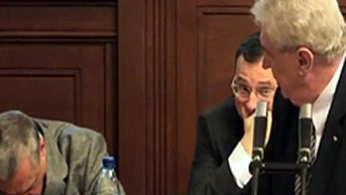 Çek Cumhuriyeti Cumhurbaşkanı Milos Zeman mecliste konuşma yaparken, arkadaki kürsüde bulunan Dışişleri Bakanı Karel Schwarzenberg'in uyuklaması kameraya yansıdı.