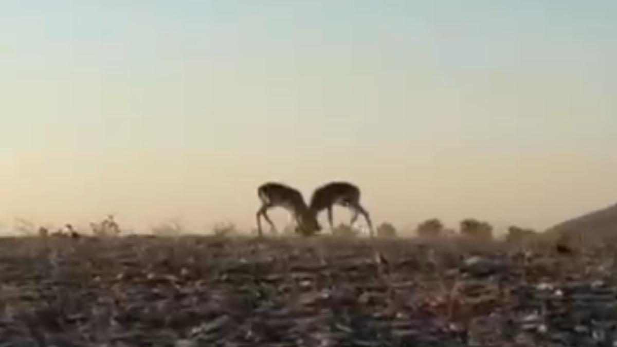 Hatay'ın Kırıkhan ilçesinde iki erkek dağ ceylanının (gazella gazella) kafa kafaya verdiği mücadele, cep telefonuyla görüntülendi.