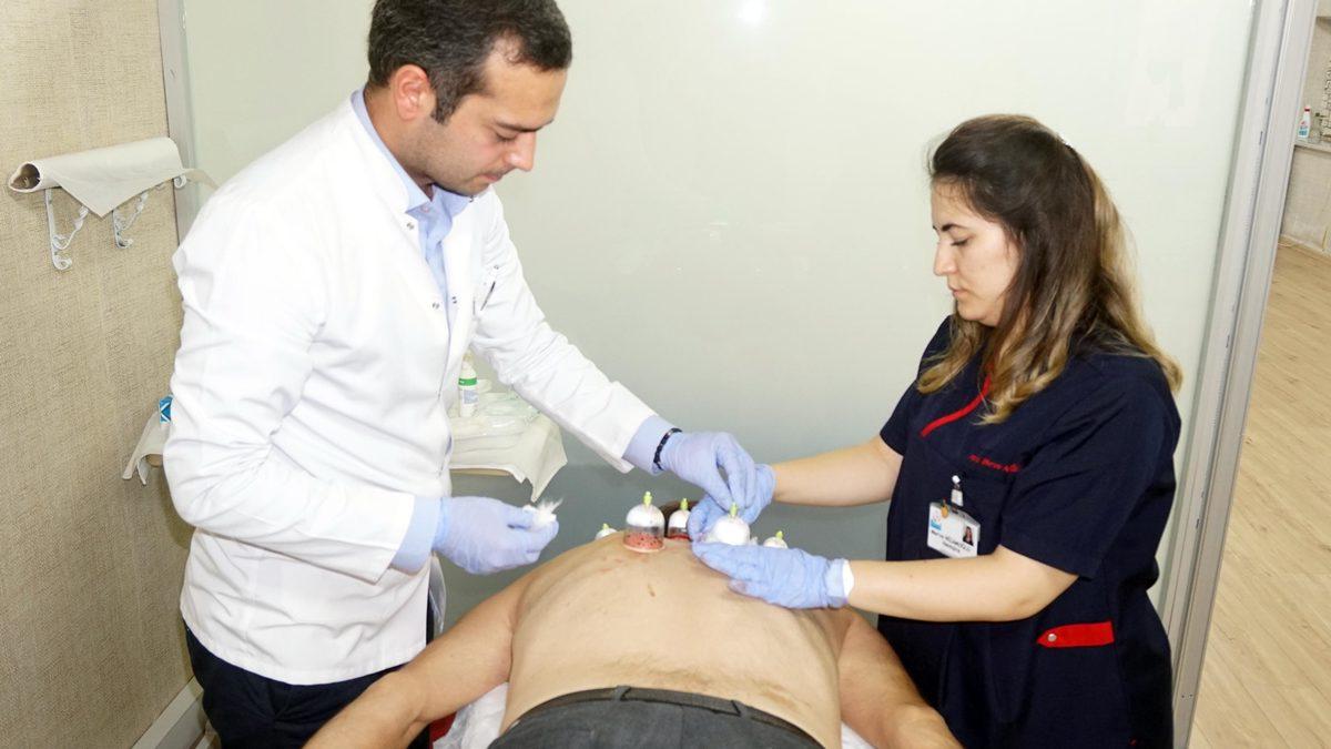 Başhekim Özdemir, kas ağrısı nedeniyle hastaneye başvuran vatandaşlardan Hasan Fahri Aksoy’un acil serviste ağrı kesiciler sayesinde kısa süreli iyileşme yaşadığını ancak sonra yeniden rahatsızlandığını belirtti. Özdemir, hastasının geleneksel ve tamamlayıcı tıp uygulaması için merkeze başvurduğunu ifade ederek, "Hastamız biraz fayda görebileceği geleneksel ve tamamlayıcı tıp uygulamasını öğrenince bize geldi. Kendisine hacamat tedavisinin önerdik. Hacamat tedavisiyle hastada bir rahatlama sağlanıyor. Yaptığımız uygulamada negatif basınç uyguluyoruz kupaları bağlayarak. Pompalar ile negatif basıncı oluşturduktan sonra ağrı kesici etkisi de oluşuyor. Yaptığımız bistro kesileri ile cildi sağlam tutuyoruz" dedi.