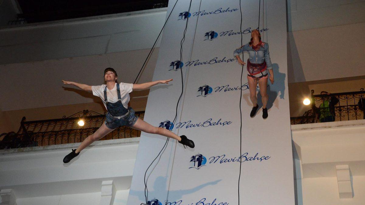 İZMİR, (DHA)- İZMİR'de bir AVM'nin duvarı podyuma dönüştürüldü ve 12 Türk model, 8 Alman akrobat model, dikey podyumda yürüyerek, izleyenlere heyecanlı dakikalar yaşattı.