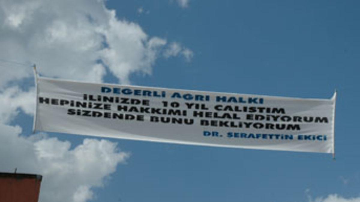 Ağrı Devlet Hastanesi'nin değişik birimlerinde 10 yıl süreyle görev yapan pratisyen doktor Şerafettin Ekici, tayininin İstanbul'a çıkması nedeni ile Cumhuriyet Caddesi'ne pankart astırdı.