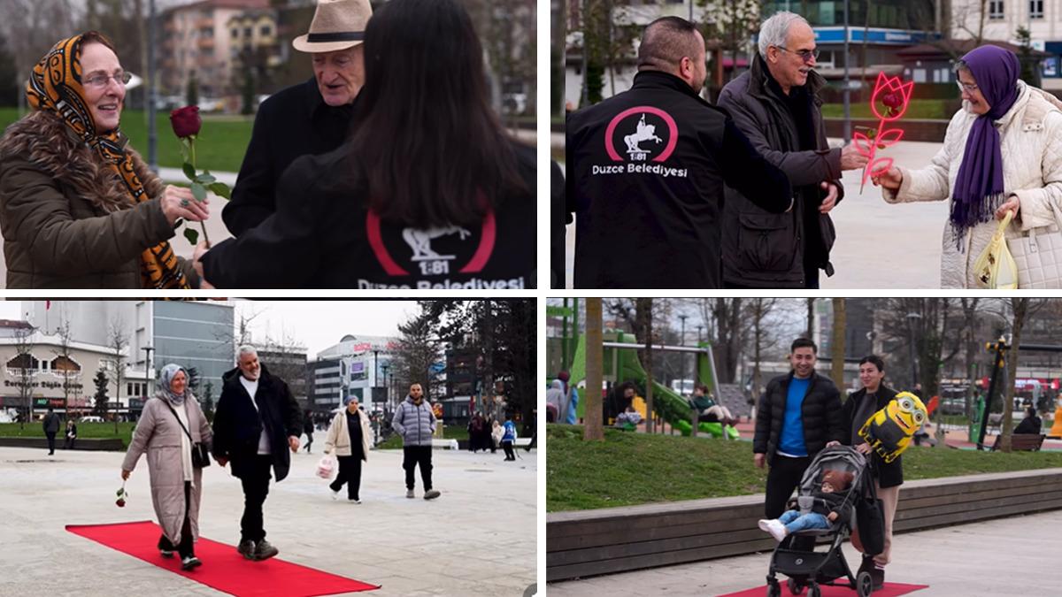 Belediyenin düzenlediği sürpriz etkinlikle caddede yürüyen çiftlerin önüne kırmızı halı serildi, gül hediye edildi.