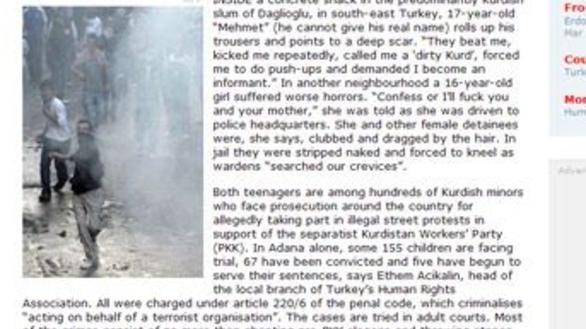 "Türkiye'de yüzlerce Kürt çocuğu, ayrılıkçı PKK destekleyen yasa dışı sokak gösterilerine katıldığı iddiası ile yargılanmakla karşı karşıya" iddiasına yer veren dergi, İHD Adana Şübesi yöneticilerine dayanarak "Sadece Adana'da 155 çocuğun yargılandığı, 67 çocuğun mahkum olduğu ve beşi hakkında verilen hapis cezasını çekmeye başladığını" öne sürdü.
