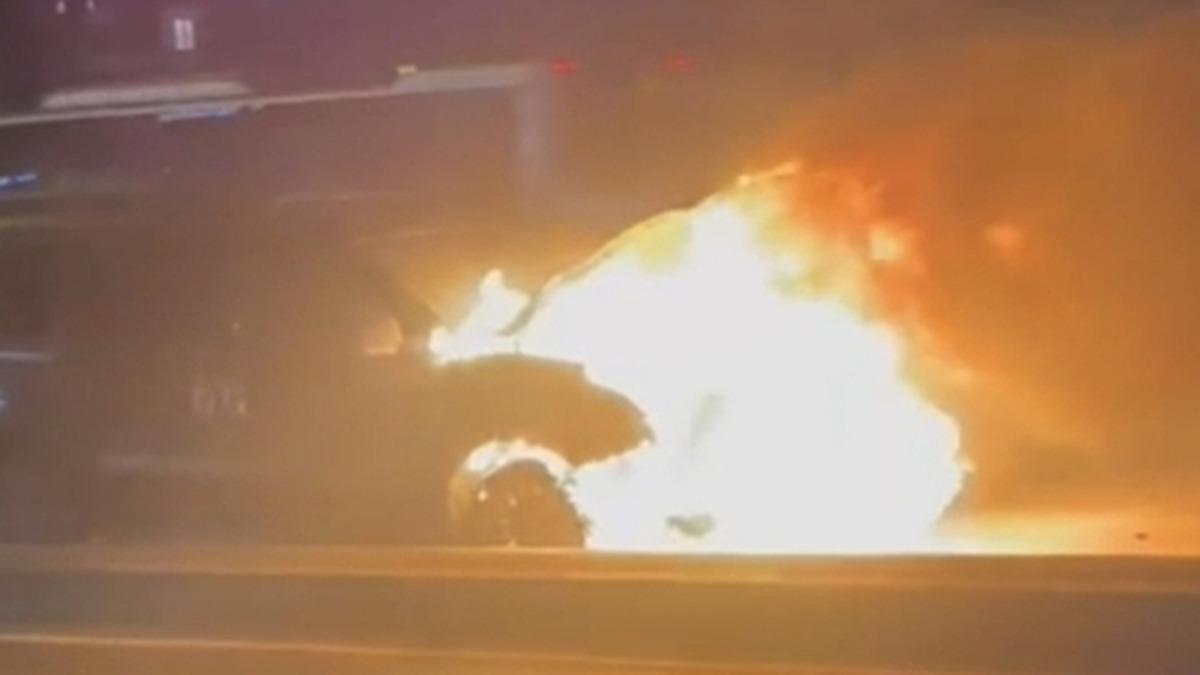 Hafif ticari aracın alev alev yandığı anlar yoldan geçen başka sürücüler tarafından cep telefonuyla kaydedildi. Yangının ardından hafif ticari araç kullanılamaz hale geldi.