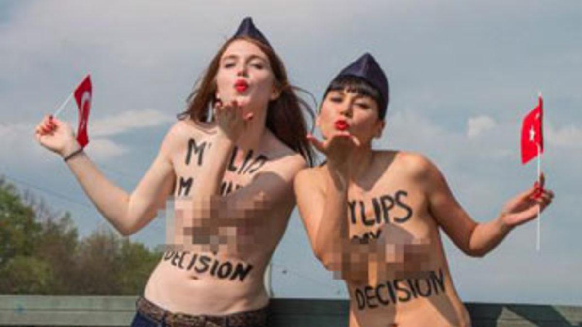 İki FEMEN üyesi ellerinde Türk bayrakları, kafalarında hostes şapkaları, dudaklarında kırmızı rujlarıyla kameralara poz verdi. FEMEN’cilerin vücutlarındaki “My lips, my decision” (Benim dudaklarım, benim kararım) cümlesi dikkat çekti.