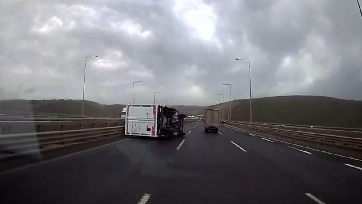 Kocaeli'de gece saatlerinden itibaren etkili olan fırtına, Kuzey Marmara Otoyolu'nda ulaşımda aksamalara yol açtı. Otoyolun Dilovası ilçesi geçişinde seyir halinde olan iki tır ve kamyonet, şiddetli rüzgarın etkisiyle kontrolden çıkarak devrildi. Kazalarda şans eseri yaralanan olmazken, kamyonetin devrildiği anlar güvenlik kamerasına yansıdı.