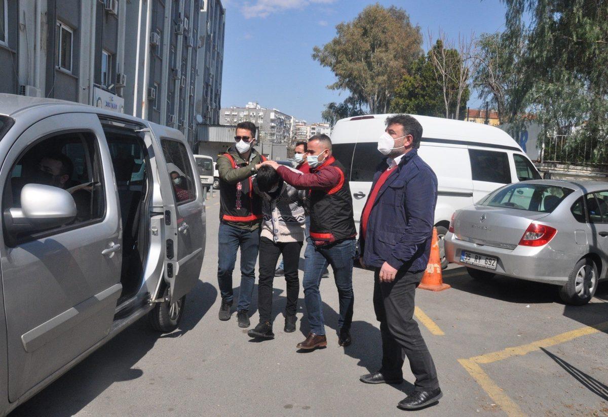 İzmir’in Konak ilçesinde, 5 aylık hamile dini nikahlı eşini 16 yerinden bıçaklayarak öldüren zanlı, emniyetteki işlemlerinin ardından adliyeye sevk edildi.