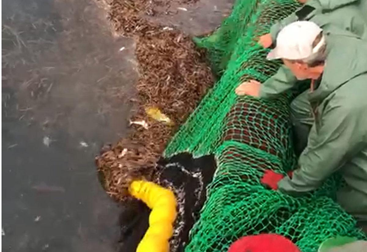 Haznede toplanmış erişte yığınının içinde sıkışıp kalan hayvan, bir süre sonra göründü. Erişteler arasından kafasını çıkaran deniz kaplumbağası, kürek biçimindeki ön ayaklarını kullanarak yüzmeyi başardı. Hızlıca ağlardan uzaklaşan deniz kaplumbağası, mavi derinliklere dalarak gözden kayboldu.