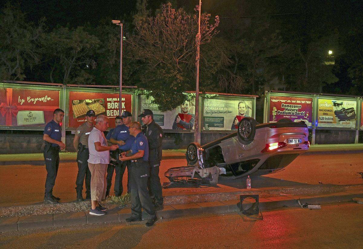 Çarpmanın şiddetiyle savrulan otomobil ters dönerek sürüklenirken trafik lambası direği de yola devrildi.