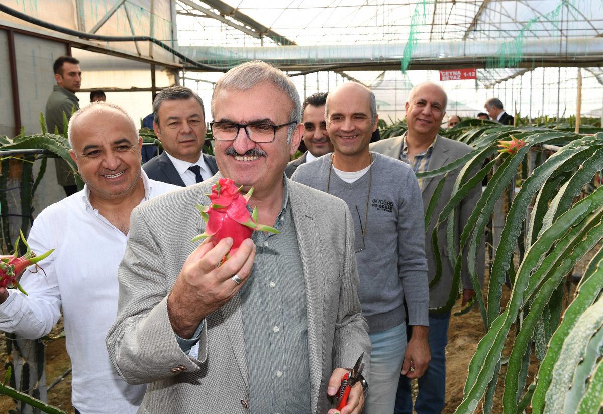 Mehmet ÇINAR/ANTALYA, (DHA)- ANTALYA Valisi Münir Karaloğlu, muz ve ejder meyvesi olarak da bilinen pitaya seralarında hasada katıldı. Tanesi 20-30 lira olan pitayada bu yıl 75 dekarda 45 ton rekolte bekleniyor.