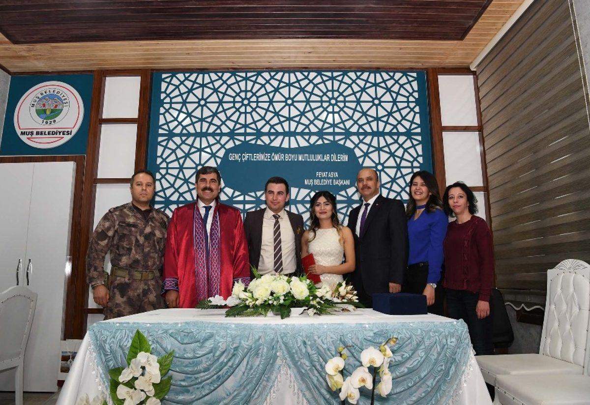 Muş’ta görev yapan polis memuru Murat Gürçetin ile Hatice Şeymanur Kurt çiftinin nikahını Belediye Başkanı Feyat Asya kıyarken, İl Emniyet Müdürü Zafer Aktaş da şahitlik yaptı.