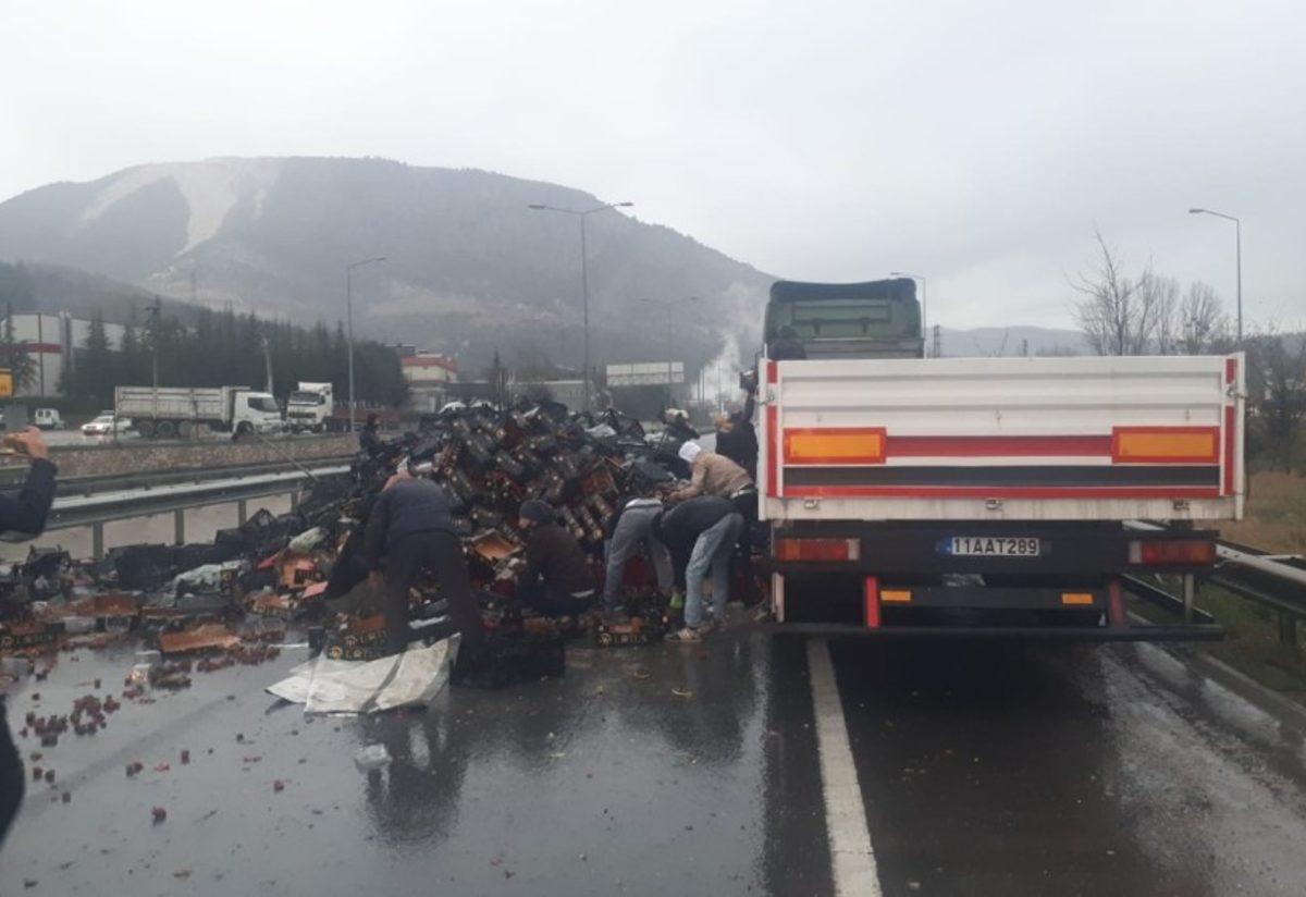 Kaza, Bilecik’in Vezirhan beldesinde meydana geldi. Bilecik’ten Sakarya istikametine giden meyve yüklü 57 EB 337 plakalı tır, sürücüsünün direksiyon hakimiyetini kaybetmesi sonucu devrildi. Kazada sürücü yara almazken, tırdaki meyveler yola savruldu. Bölgeye sevk edilen polis, jandarma ve itfaiye ekipleri, yolu bir süre kontrollü olarak trafiğe kapattı.