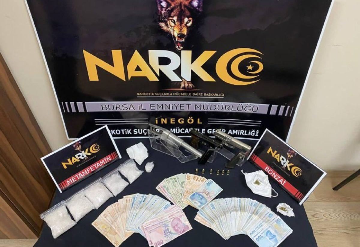 İnegöl Narkotik Suçlarla Mücadele Grup Amirliği ekipleri Huzur Mahallesinde Taşocaklarına giden yol üzerine uyuşturucu ticareti yapıldığı yönünde ihbar aldı. Bunun üzerine bahse konu adrese giden ekipleri gören şahıslar 2 araçla kaçmaya çalıştı. Nefes kesen kovalamaca sonucu kaçan 2 araç ekipler tarafından alındı. Araçta bulunan Recep D., Özgür K., Faruk S., Yusuf İslam S., Murat Y. ve Bedirhan K. isimli 6 şahıs gözaltına alındı. Şahıslar ve araç üzerinde yapılan aramalarda 413 gram metamfetamin, 4,5 gram sentetik kannobionid (bonzai), 1 adet ruhsatsız tabanca ve tabancaya ait 6 adet 9 mm mermi, 1 adet ruhsatsız kesme tüfek, 1 adet ruhsatız kuru-sıkı tabanca, uyuşturucu ticaretinden elde edildiği değerlendirilen 16.085 TL para ele geçirildi. Şahısların yapılan sorgulamalarında Murat Y. isimli şahsın 2 ayrı suçtan araması olduğu ve Bedirhan K. isimli şahsın kasten öldürmeye teşebbüs suçundan firari olduğu tespit edildi. Adliyeye sevk edilen 6 şahıstan Murat Y. , Bedirhan K. ve Faruk S. isimli üç şahıs çıkartıldığı mahkemece tutuklanırken, diğer 3 şahıs ise adlî kontrol şartıyla serbest bırakıldı.
