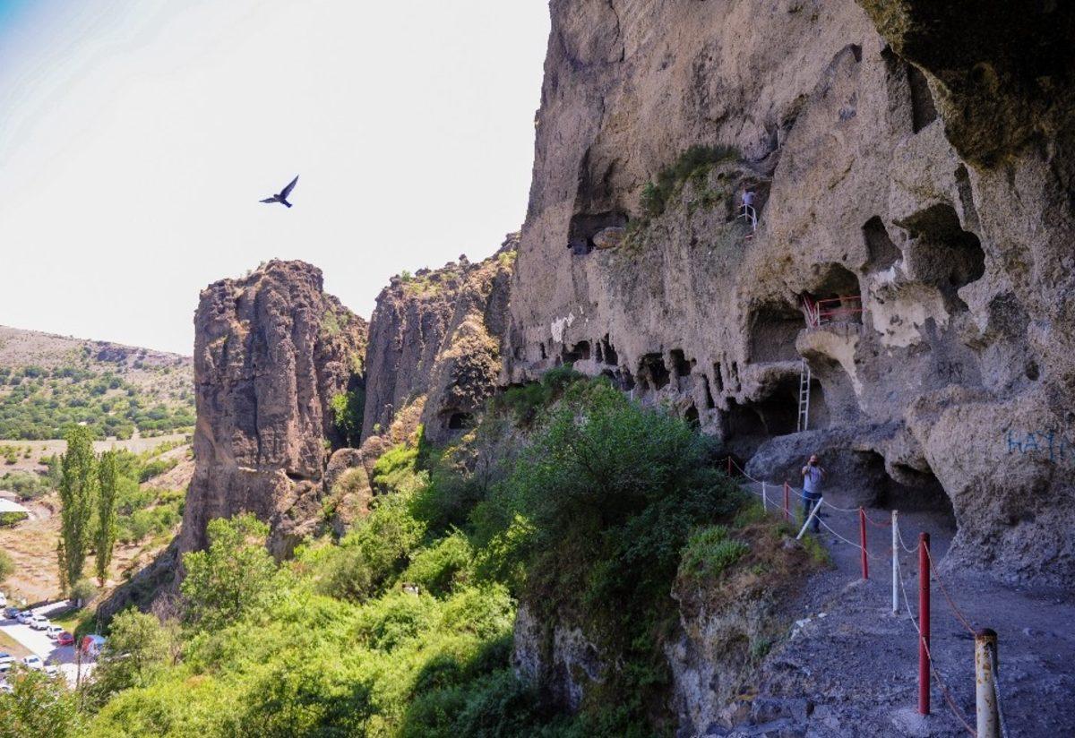 Ankara’ya 90 kilometre uzaklıkta bulunan İnönü Mağaraları’nın tarihinin milattan önce 2000’li yıllara Hititler dönemine uzandığı tahmin ediliyor. Kirmir Çayı vadisi boyunca kayalara oyulmuş mağaralar, Kültür Bakanlığı Ankara Kültür ve Tabiat Varlıklarını Koruma Kurulu tarafından 1. derece arkeolojik ve doğal sit alanı olarak koruma altında bulunuyor. Tarihi güzelliği ile vatandaşları kendine çeken İnönü Mağaraları, doğasıyla da büyülüyor. Merdivenlerden çıkarak dağın ortasına oyulu mağaralara ulaşan vatandaşlar, Kirmir Çayı ve çevresindeki doğal güzelliği yukarıdan seyretmenin keyfini çıkarıyor. İnönü Mağaraları ve çevresi drone ile de havadan görüntülendi.