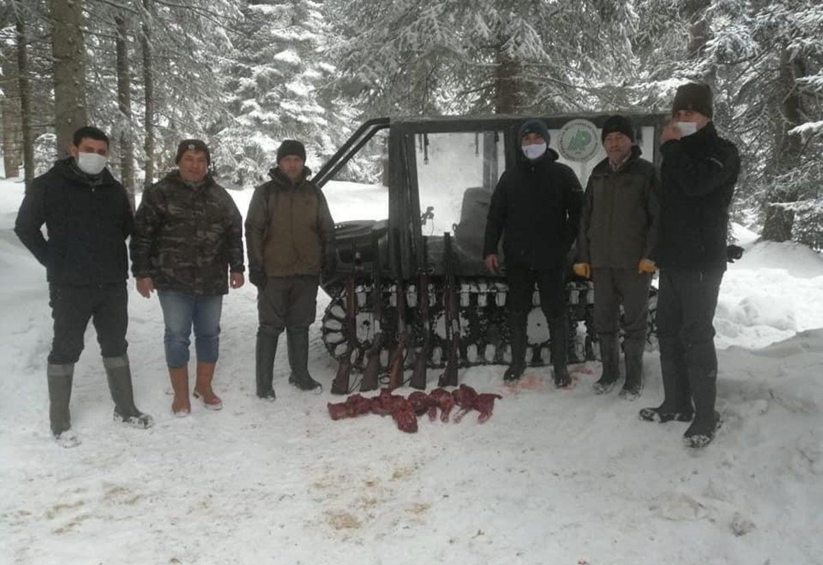 Düzce’de karla kaplı dağlarda kaçak avcılık yapanların peşine düşen Düzce Milli Parklar ve Yaban Hayatı Koruma Şube Müdürlüğü ekipleri, 5 kilometre yoğun kar yağışı altında 7 saatlik takiple kaçak avlanan ve 1 karacayı vurarak parçalayan 7 kişiyi suçüstü yakaladı.