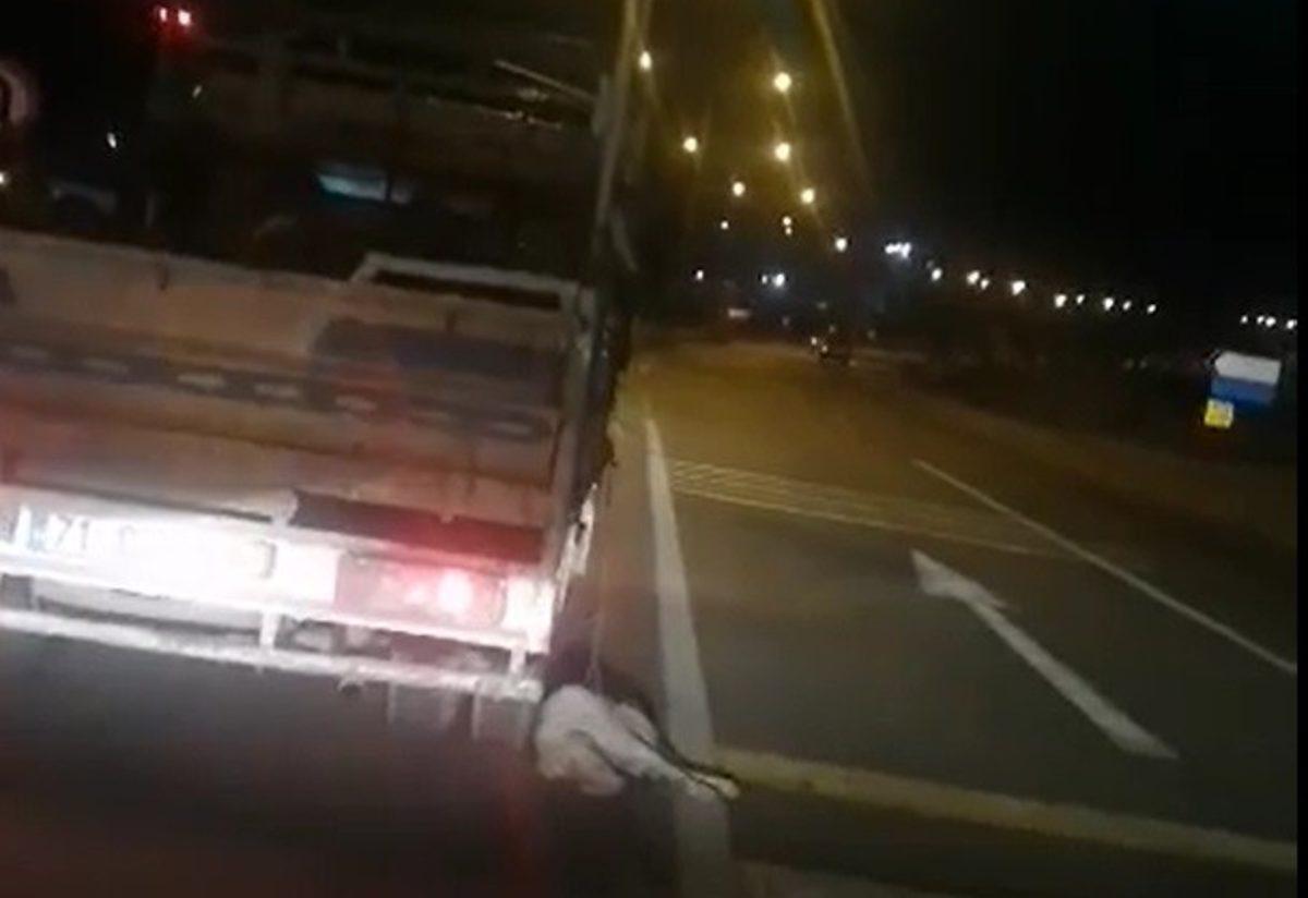 Kırıkkale’de bir kişinin, kamyonetin arkasına bağladığı köpeği sürükleyerek götürmesi yoldan geçen bir başka sürücü tarafından görüntülendi.