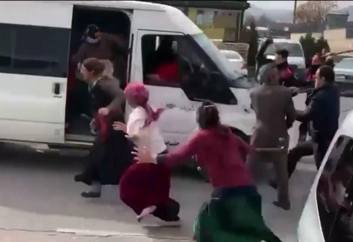 İki aile arasında yaşanan kavganın yeni görüntüleri ortaya çıktı. Görüntülerde ellerinde sopa olan erkekler kaçmaya çalışan kadınlara vuruyor. Erkeklerden kurtulmaya çalışan kadınların ezilme tehlikesi olmasına rağmen hareket halindeki minibüse binmeye çalıştıkları görüldü.