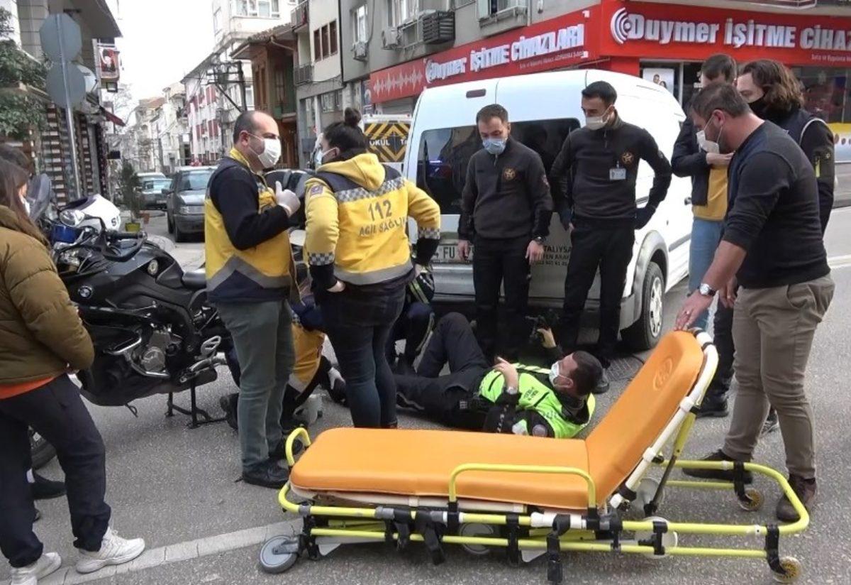 Bursa’da sokağa çıkma kısıtlamasında boş kalan yolda hatalı dönüş yapmak isteyen hafif ticari araç sürücüsü, motosikletli polis ekibine çarptı. Kazada Şahin ekibinde görevli polis memuru yaralandı.