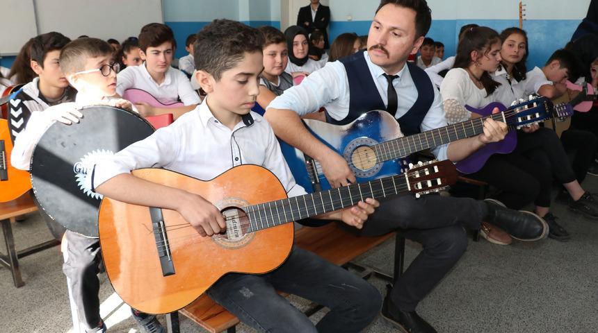Hüseyin KALAY/ASARCIK(Samsun),(DHA)- SAMSUN'un Asarcık ilçesindeki Kılavuzlu Şehit Niyazi Kaya Ortaokulu'nda müzik öğretmeni Hakan Turgut, öğrencilerini kendi derslerinde gitarla tanıştırıyor. Konservatuvarı andıran sınıflarda öğrencilerin çoğu aldıkları eğitimlerle gitar çalmayı öğreniyor, mezun olduktan sonra da müziğe ilgisi devam eden öğrencilerden bazıları ilgili bölümlere yönelip, eğitimlerini sürdürüyor.