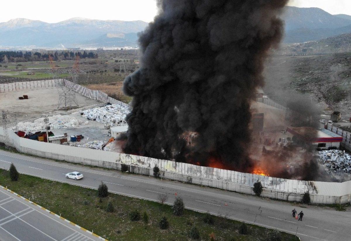 Manisa’nın Yunusemre ilçesinde bulunan geri dönüşüm tesisinde çıkan yangına itfaiye ekiplerinin müdahalesi devam ederken yangın havadan görüntülendi.
