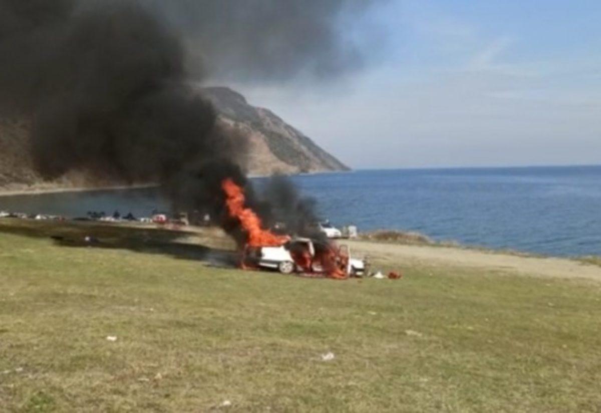 Tekirdağ’ın Şarköy ilçesi Uçmakdere’de bulunan paraşüt iniş alanında piknik yapan vatandaşın aracı alev alev yandı.