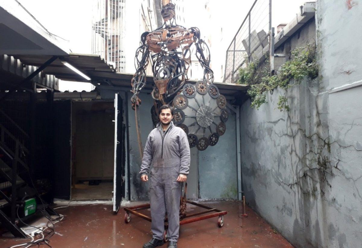 Bahçelievler’de Otomasyon Teknolojisi bölümü mezunu Ali Diyar, atölyesinde biriktirdiği hurda araba ve eski makine parçalarından 4,5 metre uzunluğunda "yeniçeri" heykeli yaptı.