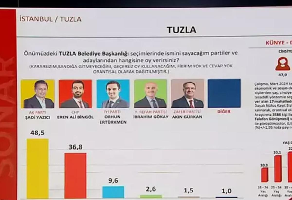 Tuzla'da da büyük sürpriz var. AK Parti Şadi Yazıcı 48,5, CHP Eren Ali Bingöl 36,8.