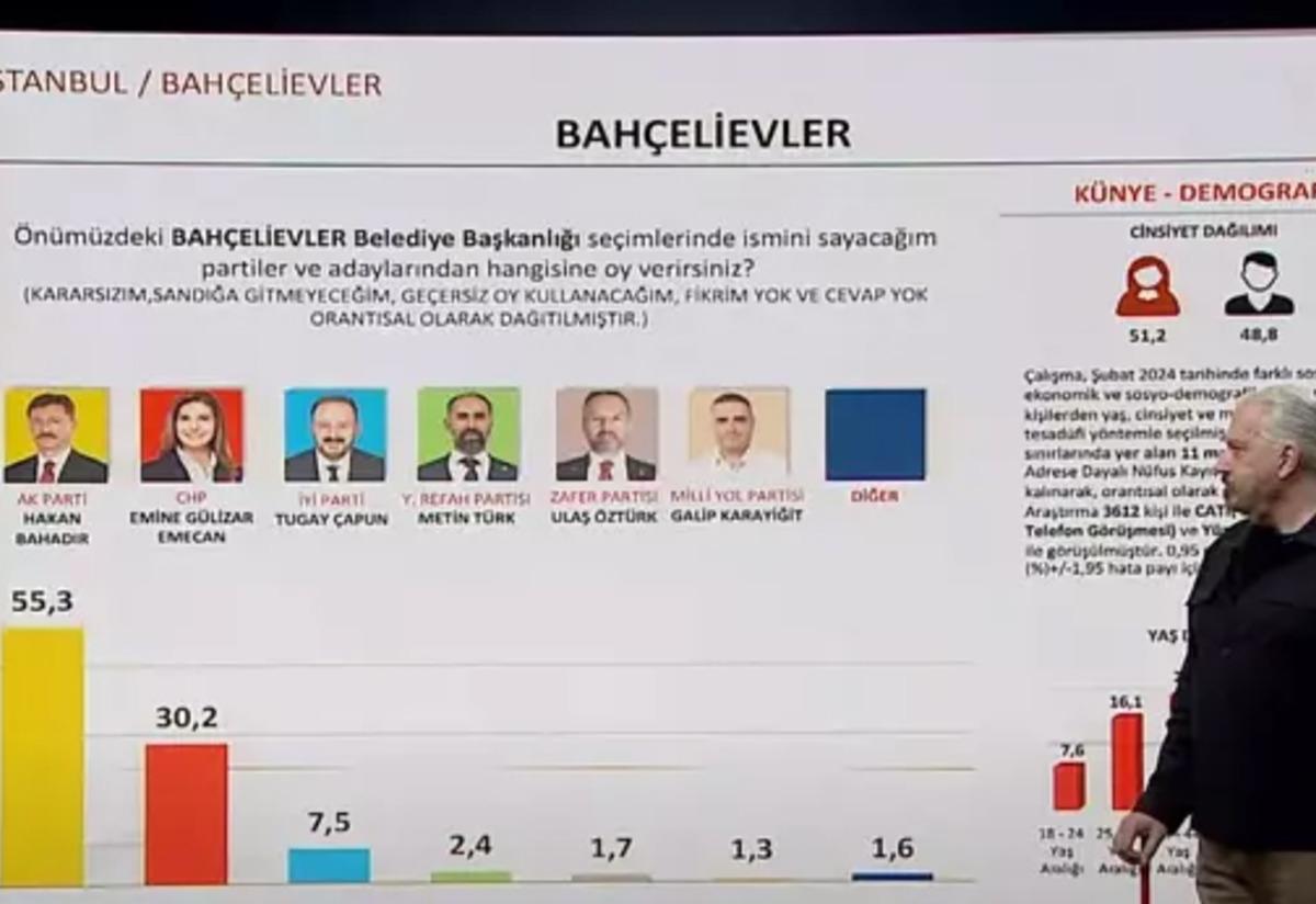 Bahçelievler'de AK Parti Hakan Bahadır 55,3 CHP ise 30,2 oranına sahip. Burada Milli Yol Partisi de 1'in üzerinde çıkan partilerden bir tanesi. CHP'nin burada 7,5 puanı İYİ Parti'ye gitmiş. Zafer Partisi demek Kılıçdaroğlu'na vermiş o seçimde. Hakan Bahadır Kemal Bey'e oy vermiş bir bölüm insandan da oy almış bu orana göre.