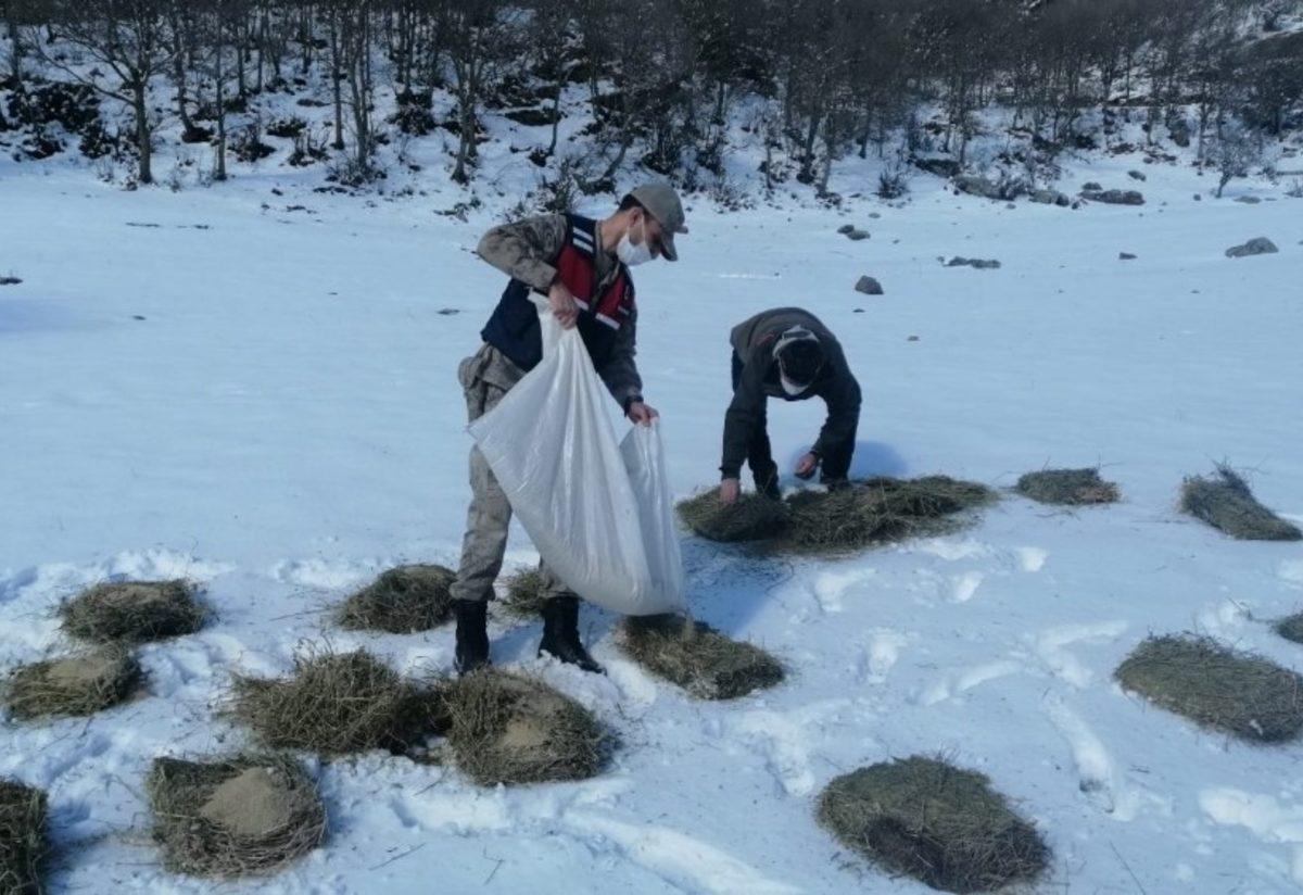 Gaziantep’te jandarmalar bir dönem terörist kovaladıkları Amanos Dağlarında yağan kar nedeniyle yaban hayvanlarının aç kalmaması için yem bıraktı.