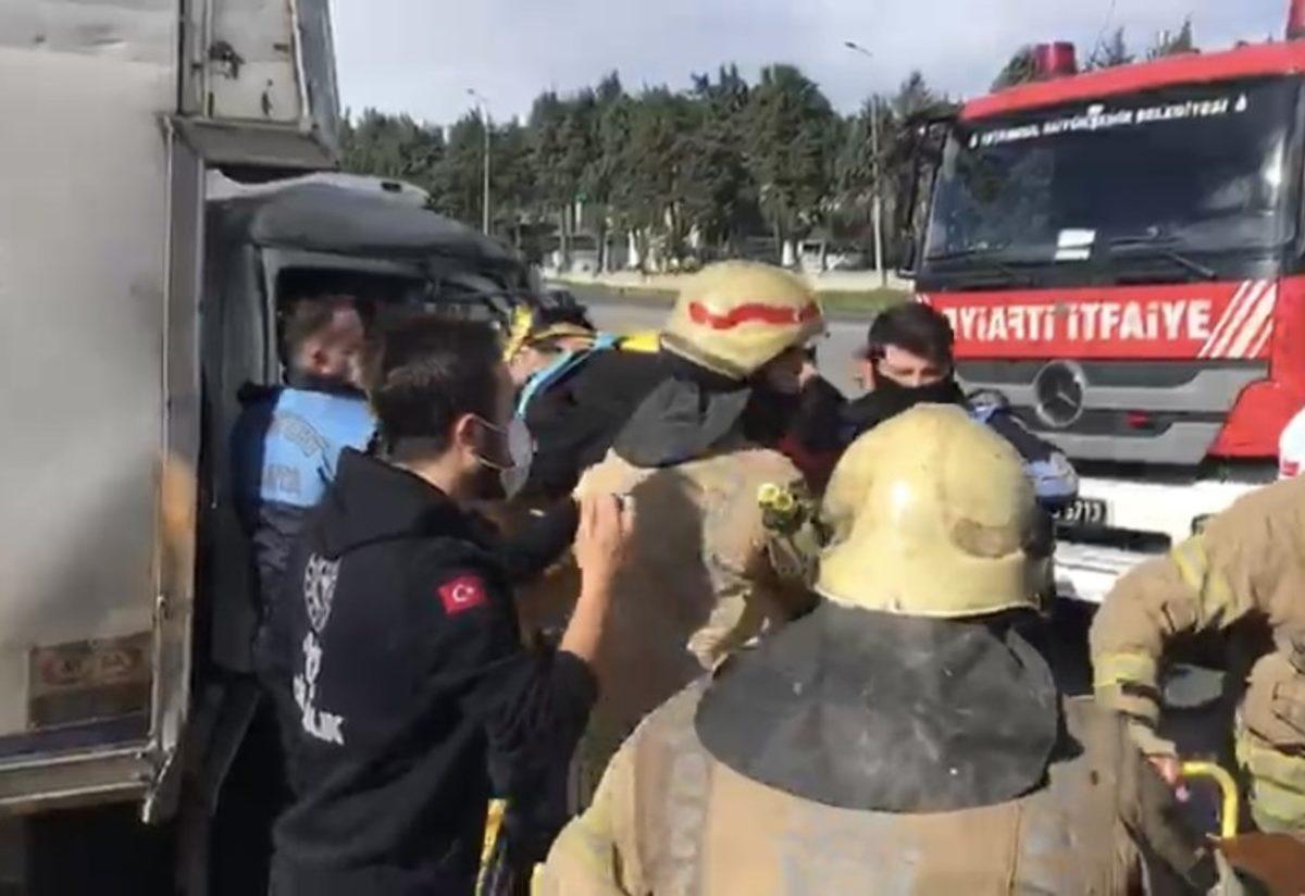Esenyurt’ta seyir halindeki tır ve kamyonet kafa kafaya çarpıştı. Kamyonetteki sürücü sıkıştığı araç içinden vatandaşlar tarafından yaralı olarak çıkarılırken, kaza anı kameraya yansıdı.