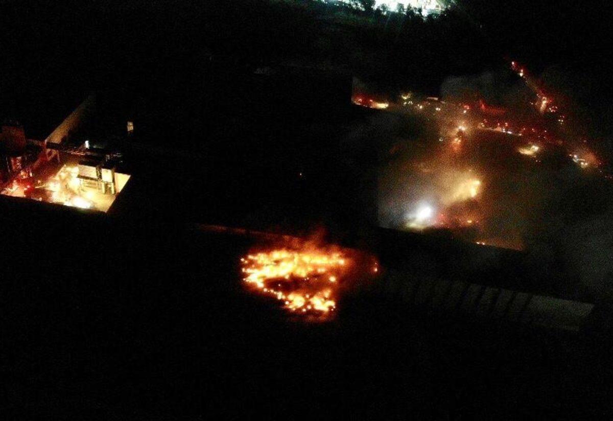 Öte yandan yanan iş yeri drone ile havadan görüntülendi.