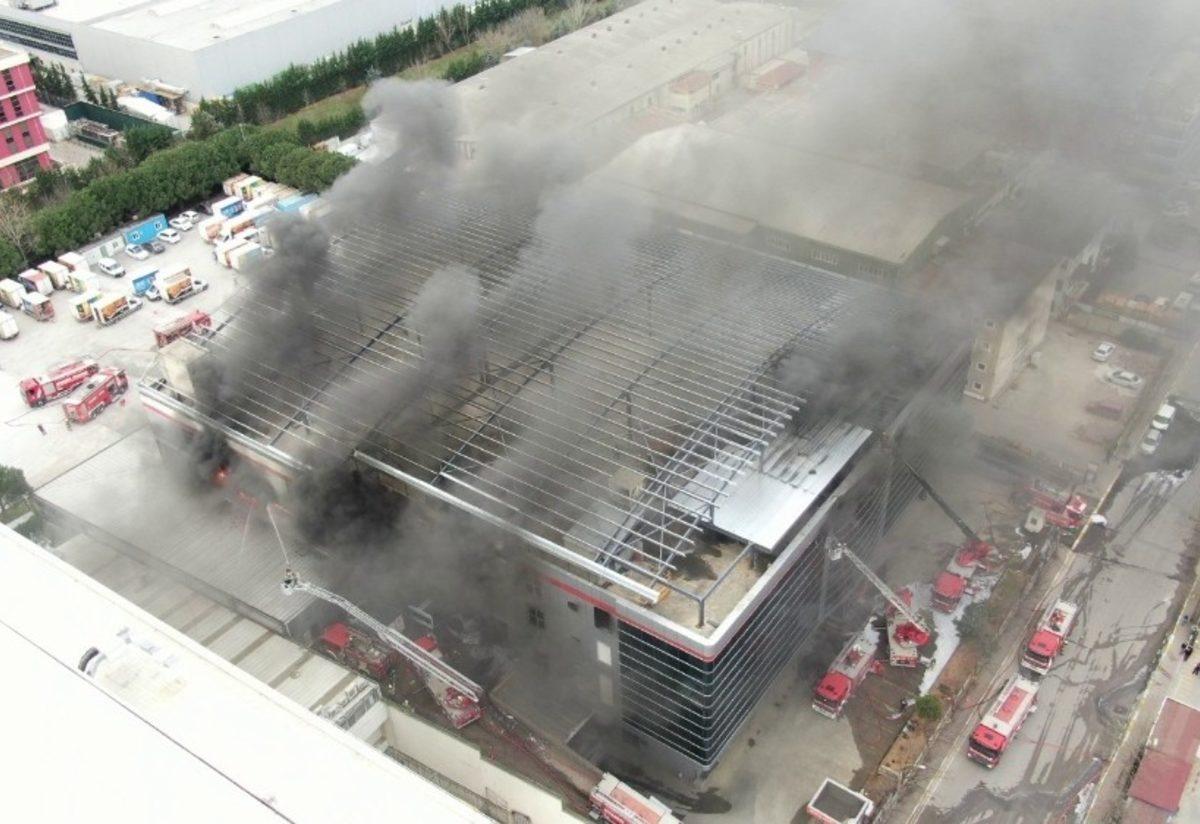 Ümraniye’de bir sünger fabrikasının 4. katında yangın çıktı. Paniğe neden olan yangın drone ile havadan görüntülendi.