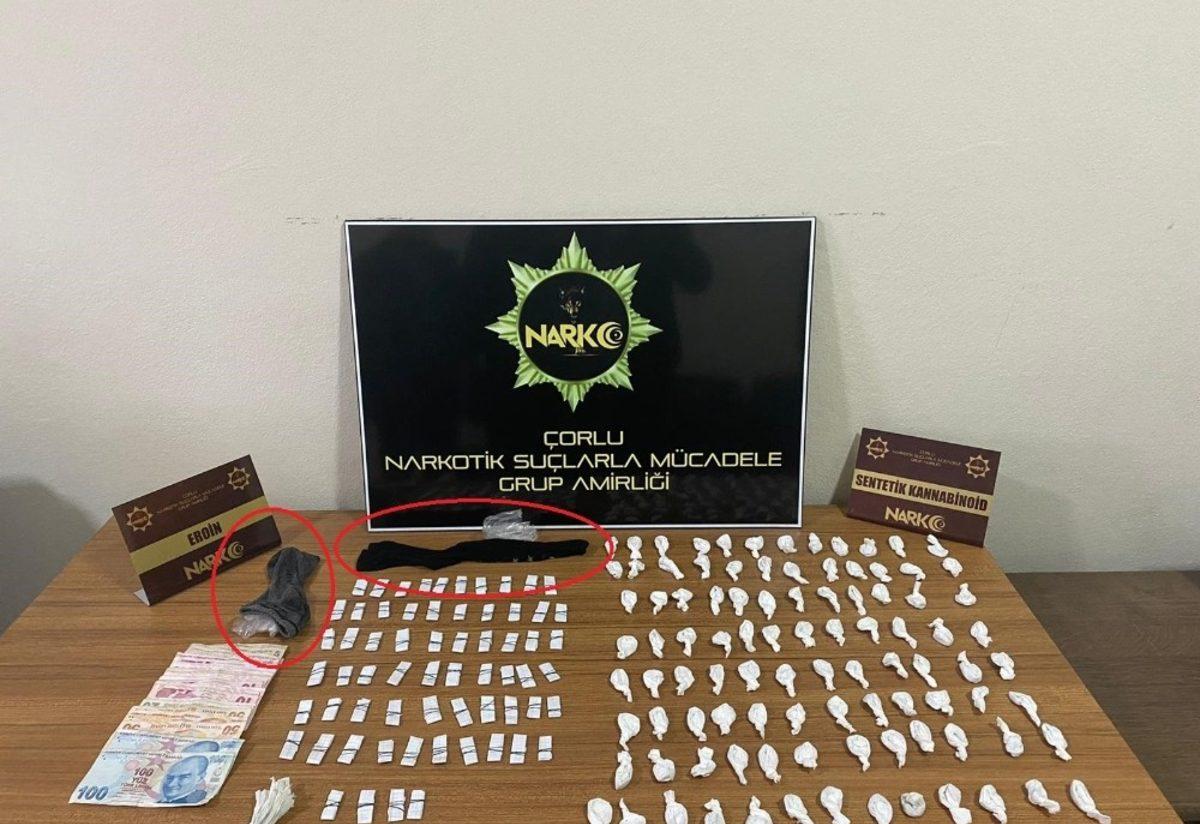 Tekirdağ’da düzenlenen uyuşturucu operasyonlarında 2’si çocuk 3 kişi yakalandı. Şüphelilerin çoraplara gizledikleri bonzai ve eroinler ele geçirildi.