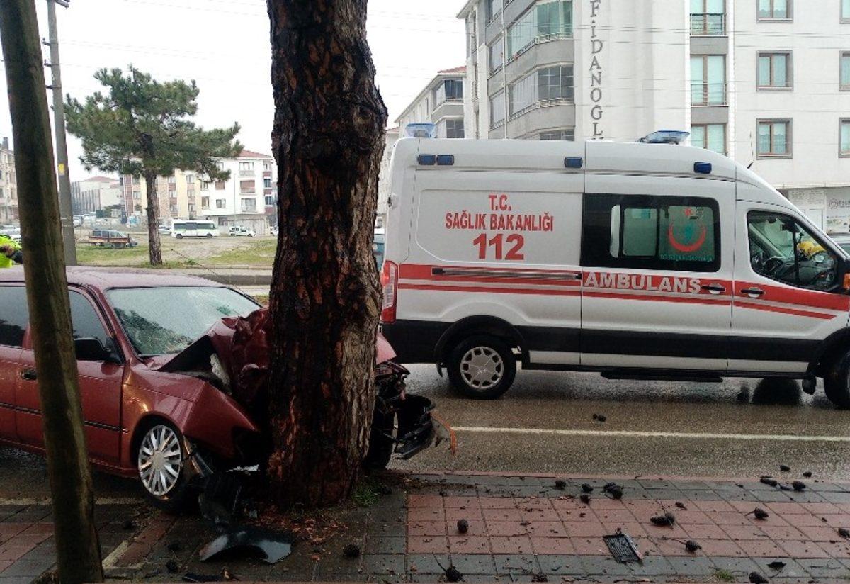 Tekirdağ’da kaygan zeminde kontrolden çıkan otomobilin ağaca çarptığı kaza kameraya yansıdı.