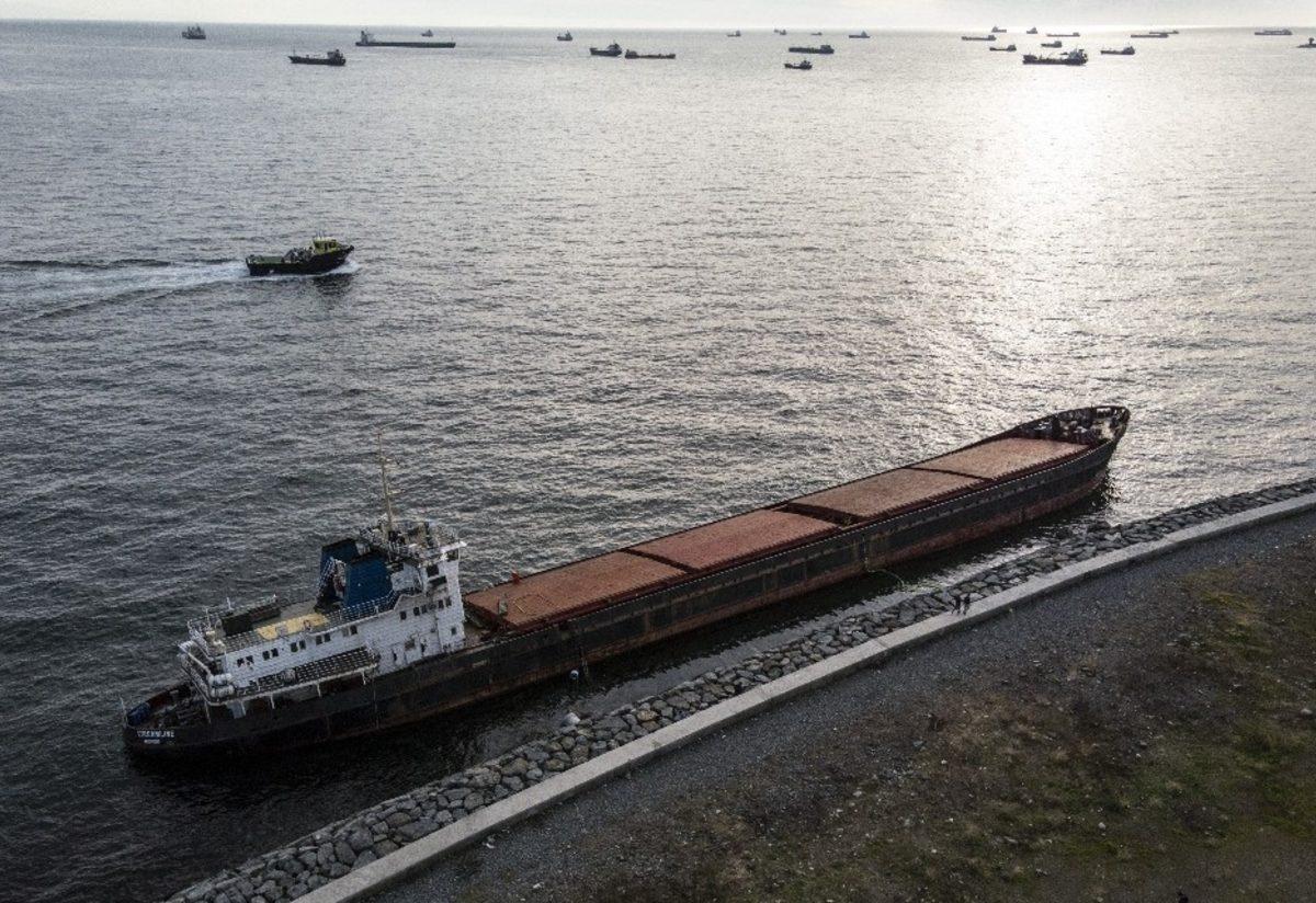 Zeytinburnu açıklarında hacizden dolayı demirli olan gemi, geçtiğimiz günlerde şiddetli fırtına nedeniyle içerisinde bulunan 2 personel ile birlikte karaya oturmuştu. İçerisinde mahsur kalan personelin kurtarıldığı geminin bekleyişi sürüyor. Halatlarla kayalara bağlanan geminin hava şartlarının düzelmesinin ardından kaldırılması bekleniyor.