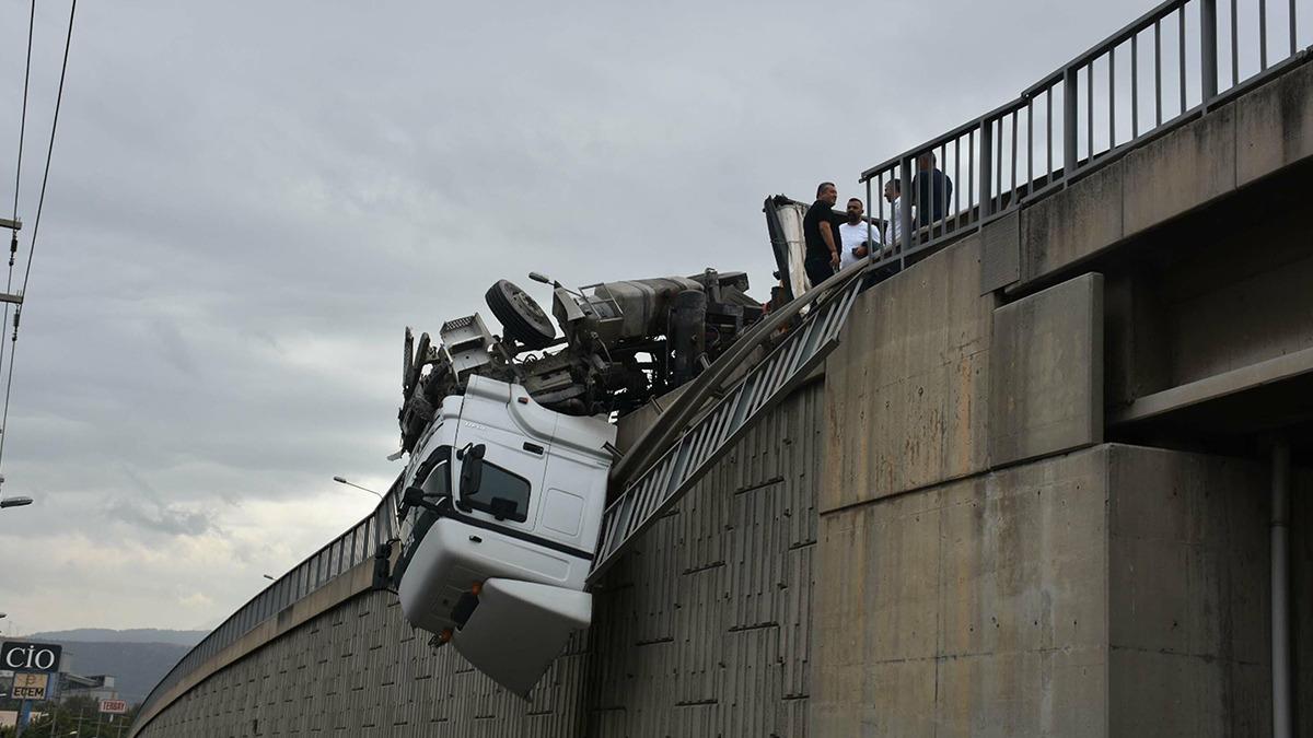 Kaza, saat 10.00 sıralarında Ankara Caddesi 4 Sanayi Üst Viyadüğü'nde meydana geldi. Bornova'dan Alsancak Limanı yönüne giden İrfan Öngen’in kullandığı taş yüklü TIR, yağmur nedeniyle kayganlaşan yolda sürücüsünün direksiyon hakimiyetini kaybetmesiyle devrildi. TIR'ın kupası viyadüğe asılı kalırken, şoför Öngen ise yaralandı.