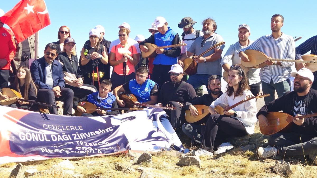 Yaklaşık 1 saatlik yürüyüşün ardından zirveye ulaşanlar, Türk bayrağının hemen yanı başında 40 sazı aynı anda çalarak Ertaş'ın "Gönül Dağı" ile farklı türkülerini seslendirdi.