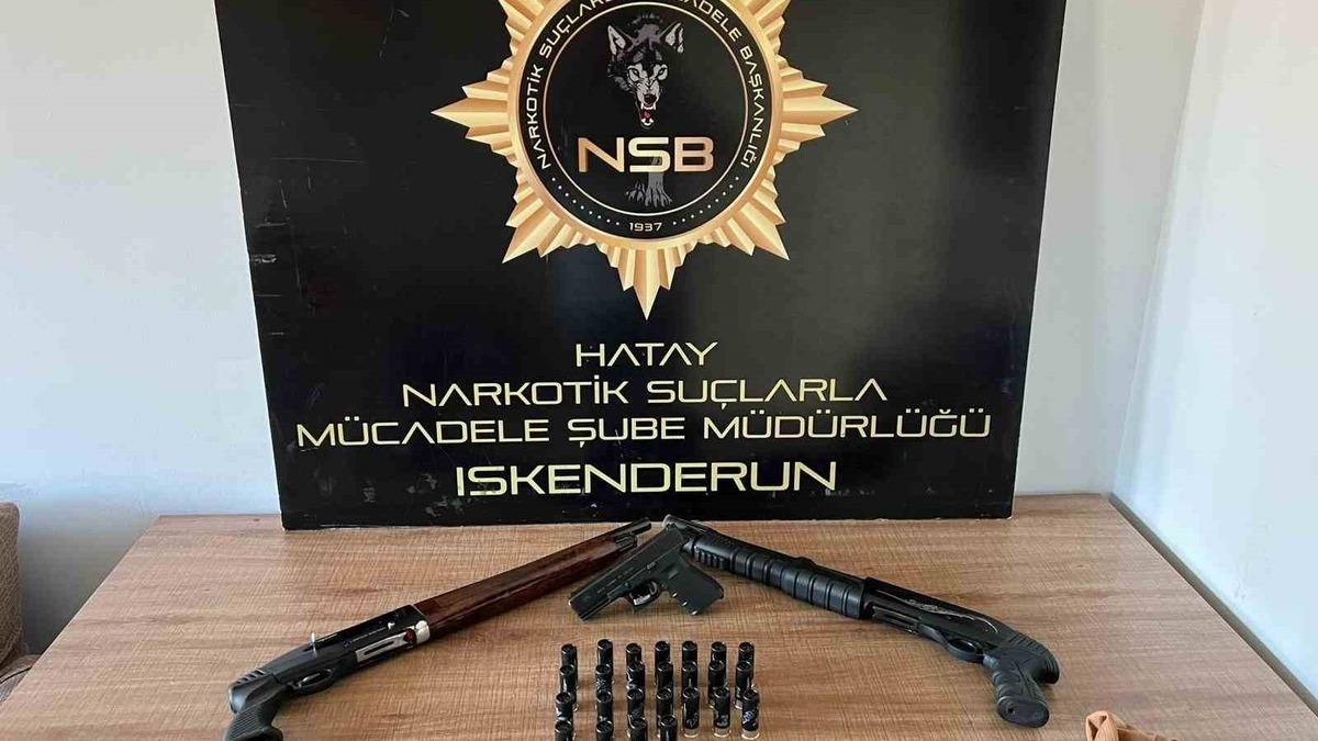 Hatay Emniyet Müdürlüğü ekiplerince uyuşturucu imal ve ticaretine yönelik çalışmalar kapsamında, İskenderun Buluttepe Mahallesi’nde bulunan İ.G.’ye ait ikamette arama yapıldı. Aramada 2 tüfek, 1 tabanca, 9 fişek ve 29 kartuş ele geçirildi. Olayla ilgili İ.G. ve F.G. yakalanarak gözaltına alındı. Şüpheliler hakkında adli işlem başlatıldı.