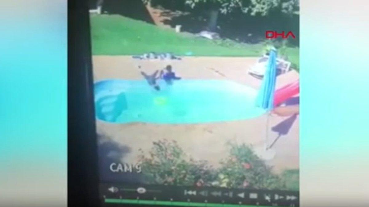 Bir yaşındaki çocuk, havuza şişme simidi almaya çalışırken suya düştü. O sırada yanında bulunan Arthur, suya düşen çocuğu kolundan çekerek dışarıya çıkarttı.