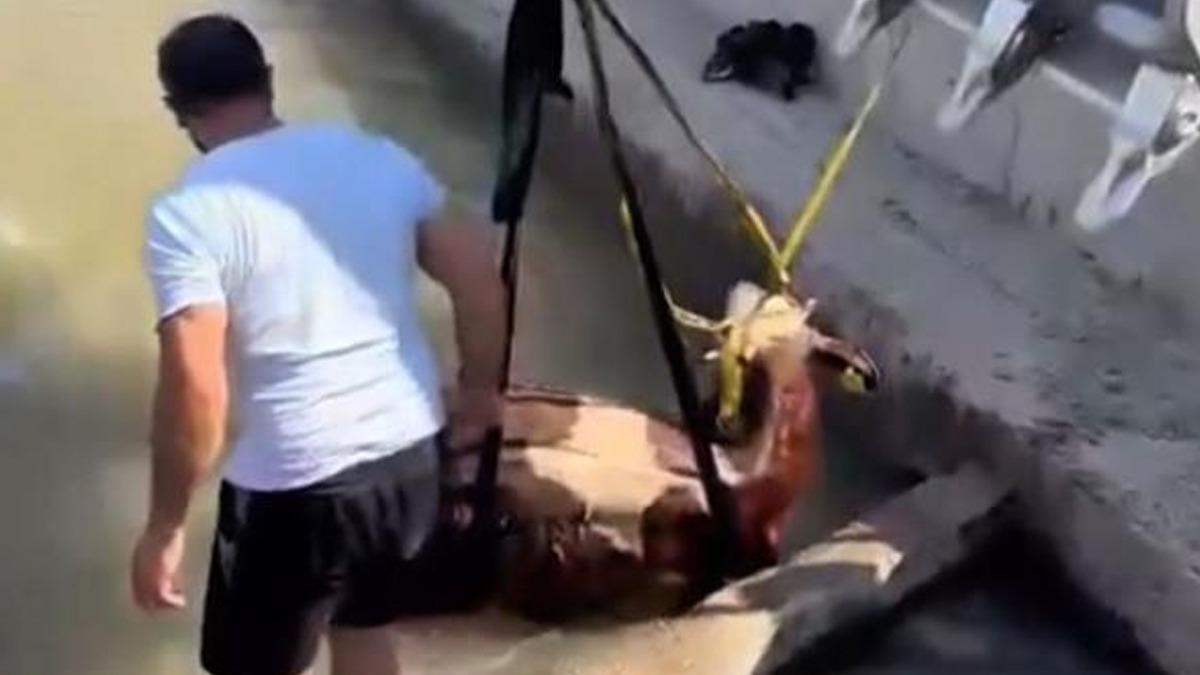 Edinilen bilgiye göre Iğdır’ın Çalpala köyünde otlayan bir inek, dengesini kaybederek su kanalına düştü. Akıntıya kapılan hayvanı gören köylüler, durumu hemen yakındaki kum ocağında çalışan kepçe operatörüne bildirdi. İki köylü suya girerek ineği iple bağladı. Kepçe yardımıyla kanaldan çıkarılan inek, sahibine teslim edildi.
