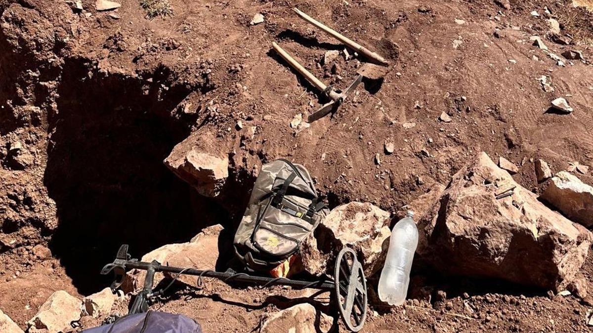 Kaçak kazı yapılan bölgede 2 keser, tepe lambası, dedektör, kazma ve kürek ele geçirildi.Şüpheliler hakkında yasal işlem başlatıldı.