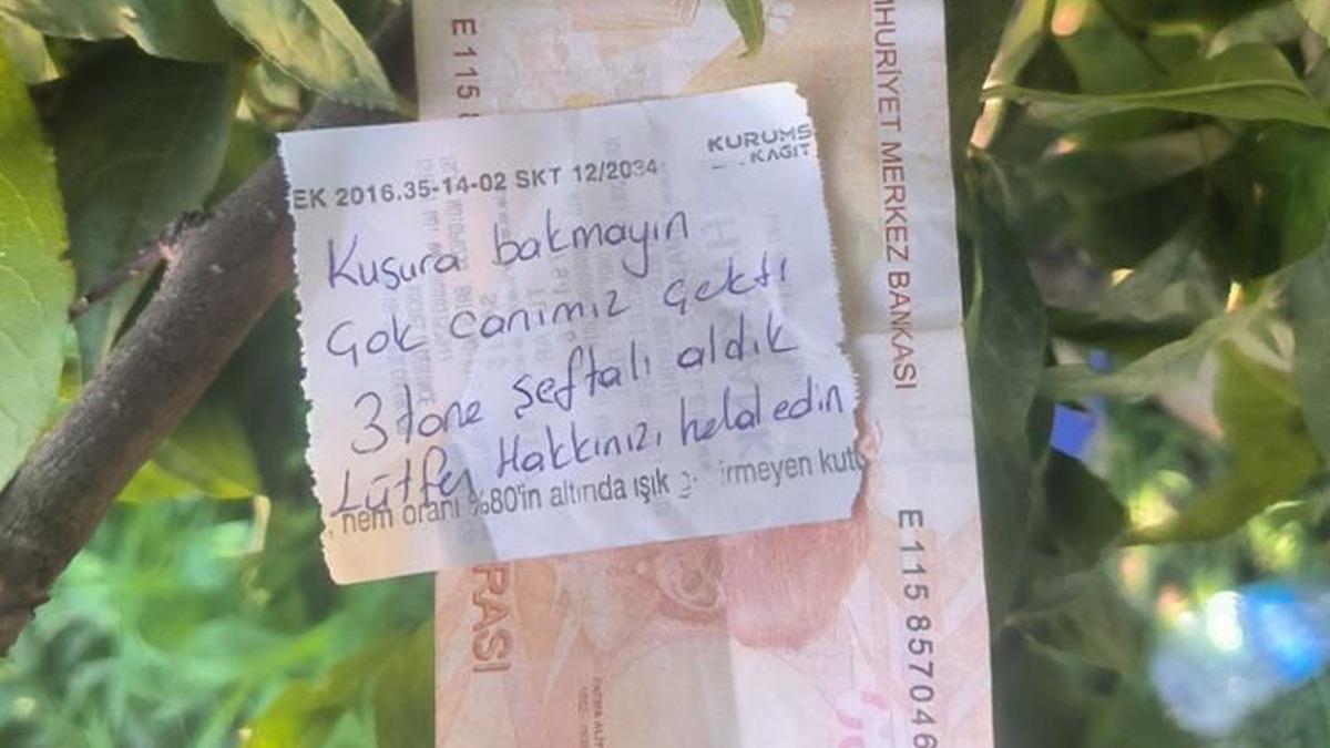 Çamdibi Mahallesi’nde bir şeftali bahçesinde sulama yapan çiftçi Ramazan Çetin dalda bir not gördü. Notta, "Kusura bakmayın canımız çok şeftali çekti, üç tane aldık. Hakkınızı helal edin" yazıyordu.