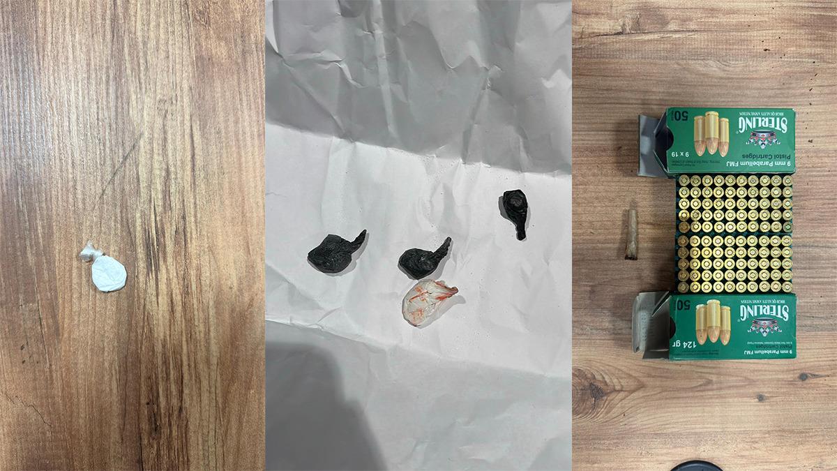 ELEKTRO MÜZİK'te 100 adet tabanca fişeği ve yaklaşık 1 gram Skunk maddesi, SUMA HAN'da ise satışa hazır 4 parça halinde yaklaşık 4 gram kokain maddesi ele geçirildi.