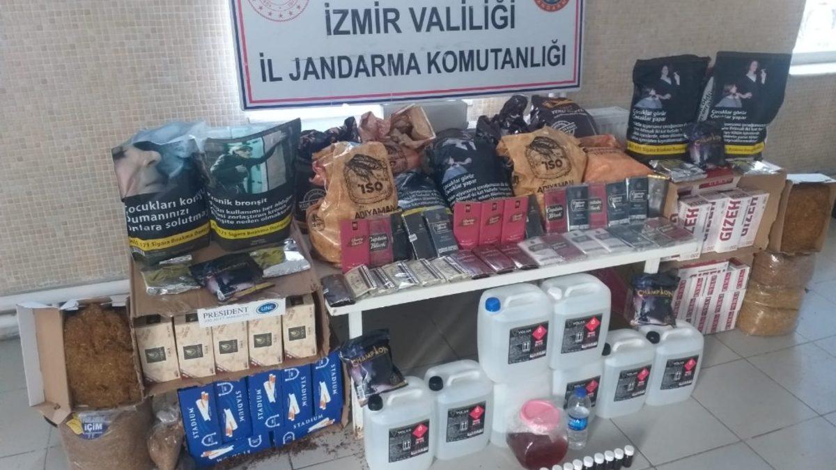 Karaburun İlçe Jandarma Komutanlığı ekipleri, Karaburun ilçesi Merkez Mahallesi’nde T.D. isimli şahsın işletmesinde kaçak alkollü içki ve bandrolsüz tütün satışı yapıldığı bilgisini aldı. Operasyonda düzenleyen ekipler; 28 bin 200 adet bandrolsüz makaron, 800 adet içi doldurulmuş bandrolsüz sigara/makaron, 3 kilogram bandrolsüz nargile tütünü, 2 kilogram 520 gram bandrolsüz pipo tütünü, 38 kilogram 685 gram bandrolsüz kıyılmış tütün, 25 litre etil alkol, 10 litre kaçak alkollü içki ve 150 mililitre anason aroması ele geçirdi. Şüpheli T.D. hakkında ise adli işlem başlatıldı.