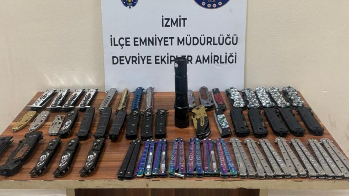 İzmit İlçe Emniyet Müdürlüğüne bağlı ekiplerce Doğu Kışla pazar alanında şüphe üzerine A.Ö. ve G.A.V. isimli yaşı küçük şahısların üzerleri arandı. Yapılan aramada çocukların üzerinden 14 kelebek tabir edilen bıçak, 13 sustalı tabir edilen bıçak, 25 normal bıçak olmak üzere toplam 52 kesici alet ile ve şok cihazı ele geçirildi.