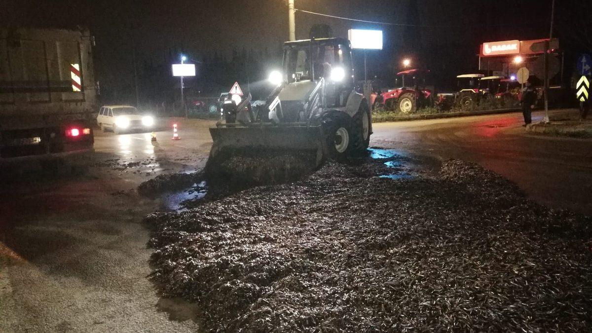 Yaklaşık bir saatlik çalışmanın ardından hamsiler kamyonlara yüklenerek karayolu tekrar trafiğe açıldı.