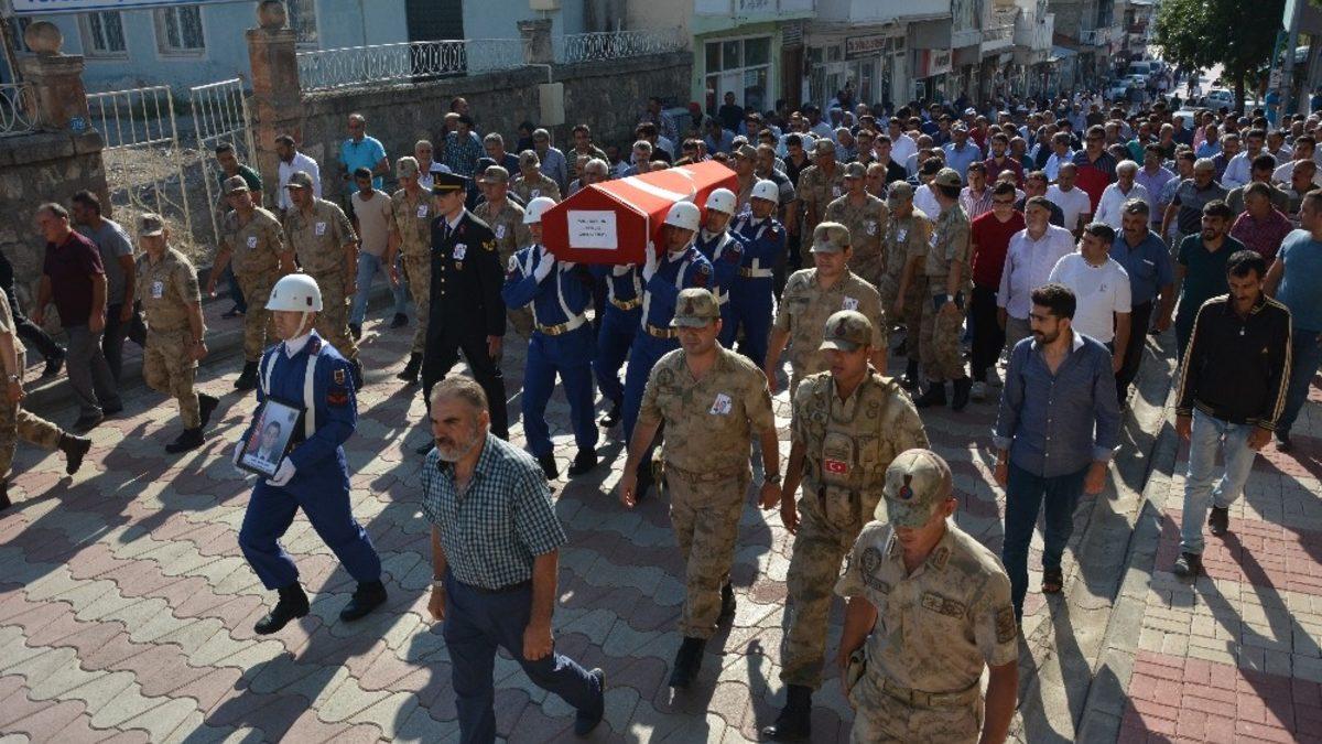 Türk bayrağına sarılı Karahan’ın naaşı meslektaşlarınca omuzlarda taşınarak köy mezarlığında toprağa verildi.