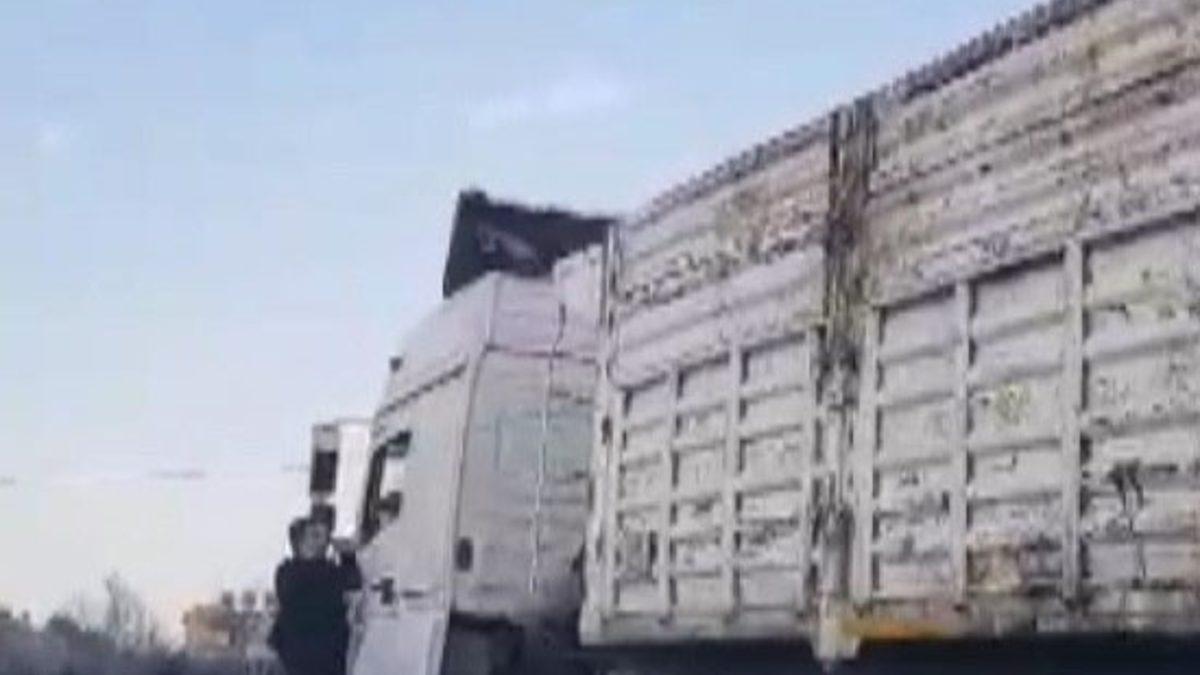Kahramanmaraş’ta seyir halindeki tırın kapısına tutunarak tehlikeli yolculuk yapan bir kişi adeta kazaya davetiye çıkardı.